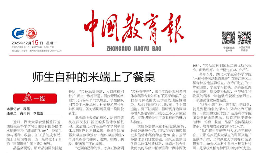 12月15日,《中国教育报》头版以《师生自种的米端上了餐桌》为题,聚焦湖北大学水稻育种科研和劳动教育。现全文转载如下:近日,湖北大学食堂稻香四溢,该校生命科学学院自主培育的多倍体水稻新品种“湖丰两优105”,经师生参与播种、收割、加工后制成米饭,端上了校园餐桌,为一场持续5个月的“田间课堂”画上香甜句号。品鉴会现场,稻米品尝区前排起长队。“粒粒晶莹饱满,入口软糯回甘。”师生一致好评道。同步开展的水稻知...